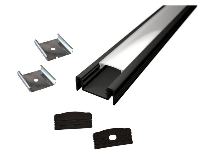 LED profil je visokokakovosten aluminijast profil, ki se ponaša z elegantno črno prevleko in je zasnovan za namestitev LED trakov. Njegova univerzalnost omogoča, da se profil lahko uporabi v najrazličnejših projektih osvetlitve, bodisi v domačem ali poslovnem okolju. Z možnostjo izbire med prozornimi, mlečnimi ali črnimi difuzorji, profil omogoča prilagoditev svetlobnega učinka glede na potrebe in želje uporabnika. Prozoren difuzor omogoča močnejšo in neposredno osvetlitev, medtem ko mlečni difuzor zagotavlja mehkejši in bolj enakomeren svetlobni učinek, ki preprečuje opaznost posameznih LED diod. Črni difuzor pa lahko ustvari dramatičen in eleganten učinek, ki je še posebej primeren za modernistične in minimalistične prostore.