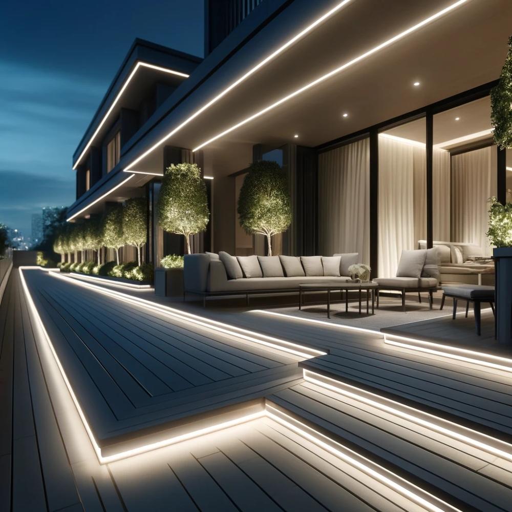 - LED trakovi: Fleksibilni in enostavni za namestitev, LED trakovi so odlični za osvetlitev robov terase ali pod ograjo, saj ustvarjajo moderno in elegantno vzdušje.