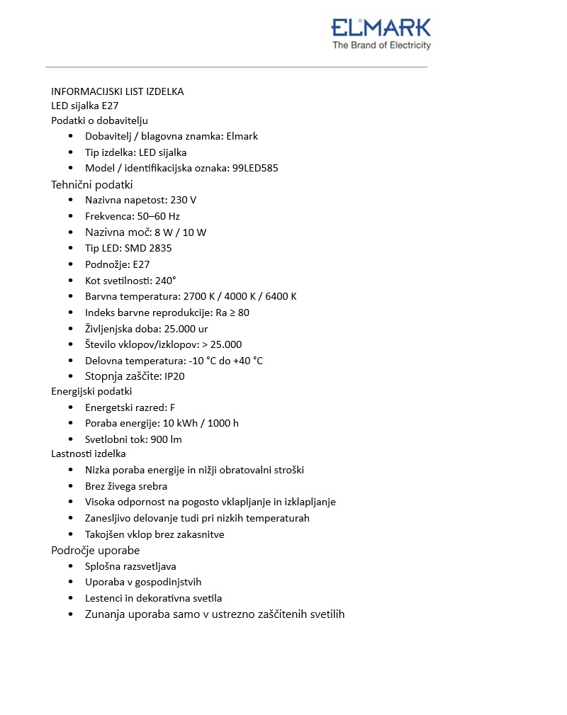 E27 LED žarnica ponuja toplo belo svetlobo, ki ustvarja prijetno in udobno vzdušje v prostoru. Ta energijsko učinkovita rešitev pomaga zmanjšati stroške električne energije. Njena dolga življenjska doba zmanjšuje potrebo po pogostih zamenjavah, hkrati pa se njena vsestranskost prilega vsakemu prostoru v vašem domu.