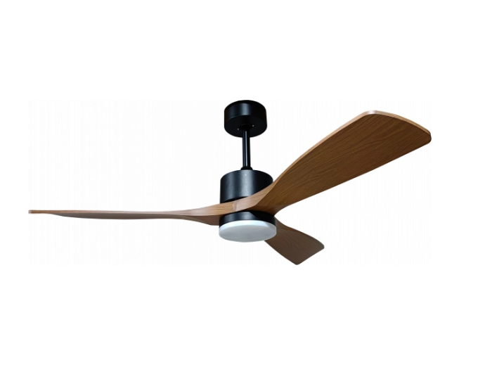Ventilator ima tri aerodinamične lopatice v naravnem videzu lesa, ki se razprostirajo iz centralnega motornega ohišja v črni barvi. Kombinacija svetlega lesa in črne kovine ustvari čist, eleganten vtis, ki se izvrstno poda tako v sodobno opremljene prostore kot tudi v bolj rustikalna okolja. Zaradi nevtralne barvne palete se brez težav vključuje v različne stile opreme, od skandinavskega do industrijskega.
