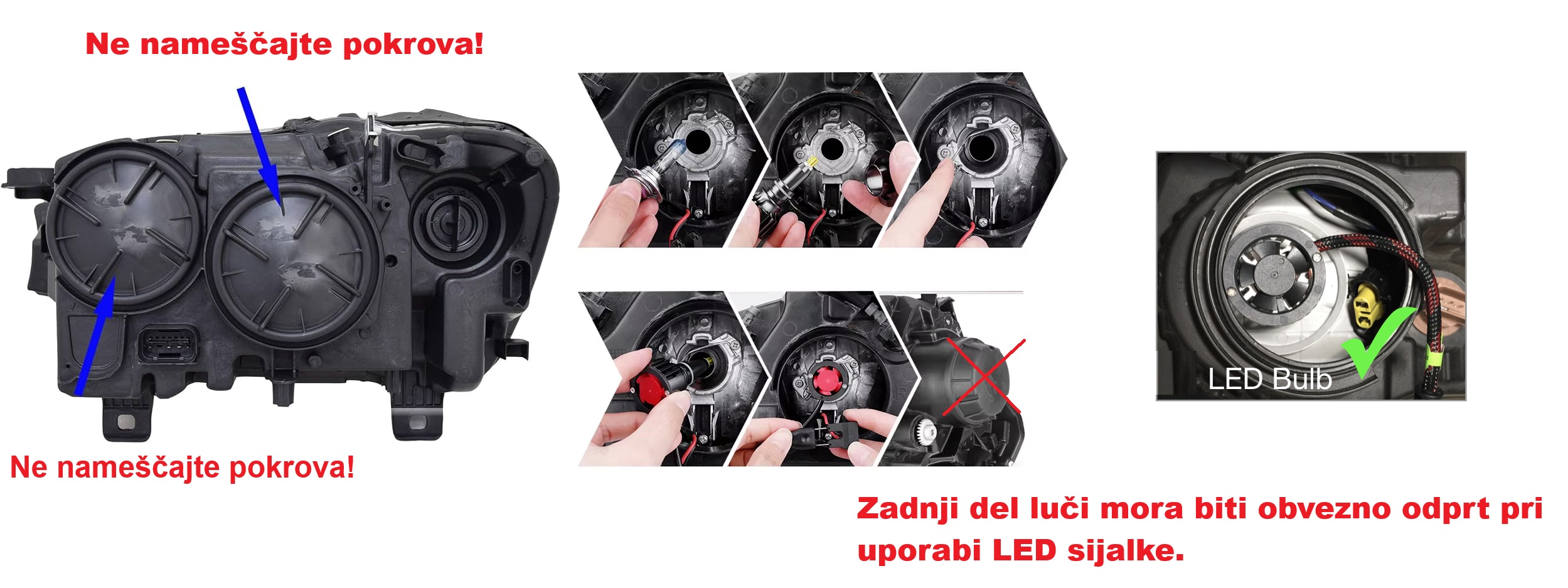 • Uporaba pokrova za LED sijalke ni priporočljiva in zato odsvetujemo uporabo pokrova (ali pa uporabljate še naprej originalno žarnico).