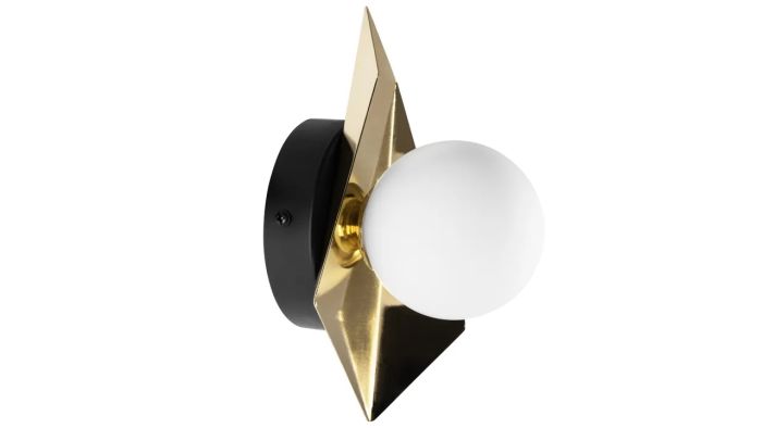 Sodobna stenska svetilka z dinamičnim dizajnom, ki združuje mat črno končno obdelavo z elegantnimi zlatimi detajli. Svetilka vsebuje okroglo belo difuzorsko kroglo, ki zagotavlja enakomerno razpršeno svetlobo, primerno za ustvarjanje tople in prijetne atmosfere. Zlati trikotni elementi, ki obdajajo svetlobni vir, dodajajo svetilki občutek luksuza in so hkrati odraz trenutnih trendov v notranjem oblikovanju. Ta stenska svetilka je popolna izbira za tiste, ki iščejo kombinacijo funkcionalnosti in sofisticiranega modernega sloga v svojem bivalnem prostoru.