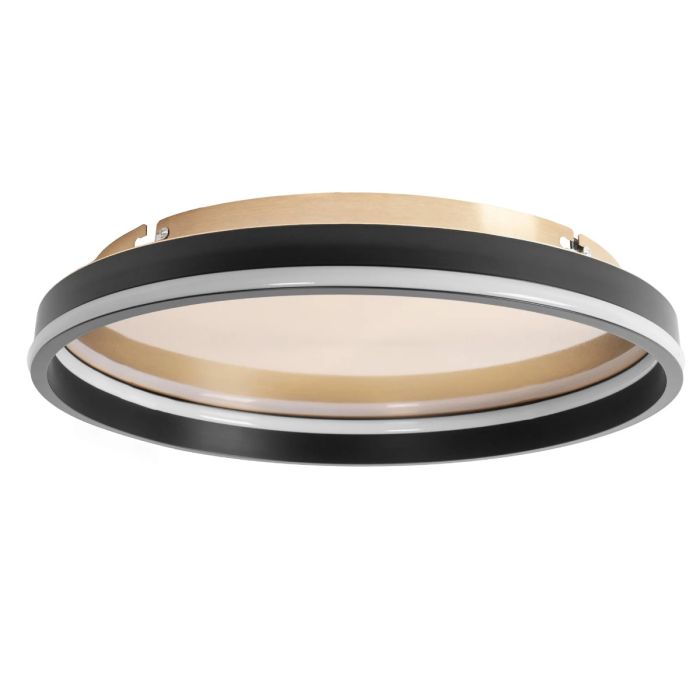 Moderna stropna LED svetilka. Svetilka ima okrogel, ploščat dizajn z dvema črnima obročema na robovih in enim belim obročem v notranjosti. Osrednji del svetilke je sestavljen iz matirane plastike, ki enakomerno razprši svetlobo. Zunanji robovi so poudarjeni z zlato ali leseno barvo, kar daje svetilki eleganten videz. Svetilka je primerna za namestitev v dnevne sobe, kuhinje ali hodnike zaradi svojega sodobnega in minimalističnega dizajna.