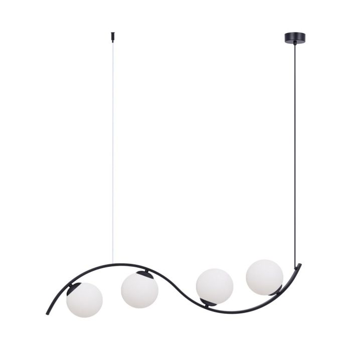 Viseča moderna svetilka s 4 kroglastimi senčniki je oblikovana za elegantno in sodobno osvetlitev vašega prostora. Izdelana je iz visokokakovostne kovine v črni barvi, s štirimi belimi kroglastimi senčniki, ki omogočajo mehko in prijetno razpršitev svetlobe. Njena valovita oblika prinaša dinamičen vizualni element, ki se odlično poda k različnim notranjim slogom, od minimalističnega do modernega. Svetilka podpira LED žarnice z grlom E14, kar zagotavlja energetsko učinkovito in trajnostno osvetlitev. S svojo edinstveno obliko in funkcionalnostjo je idealna izbira za jedilnice, dnevne sobe ali druge reprezentančne prostore.
