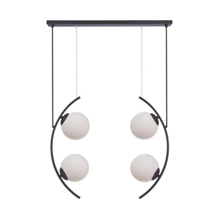 Viseči lestenec združuje sodoben dizajn z elegantnimi materiali, kot sta kovina in steklo, v kontrastni črno-beli barvni kombinaciji. Lestenec je opremljen s štirimi svetlobnimi viri z grlom E14, ki omogočajo uporabo LED žarnic z največjo močjo 8 W. Z višino 90 cm, dolžino 64 cm in širino 14 cm je lestenec idealen za osvetlitev jedilnic, dnevnih sob ali drugih notranjih prostorov, kjer je potrebna elegantna osvetlitev. Njegova edinstvena oblika z ukrivljenimi linijami in kroglastimi svetlobnimi senčniki ustvarja prijetno in razpršeno svetlobo. Ta lestenec je popolna izbira za vse, ki želijo svojemu domu dodati pridih modernosti in prefinjenosti.