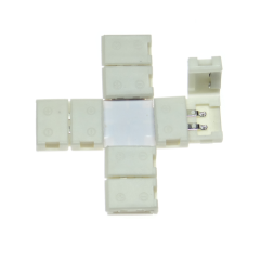 Konektorji za kotne spoje: Uporabljajo se za priključitev dveh LED trakov pod različnimi koti (npr. 90 stopinj), kar omogoča prilagodljivost pri namestitvi okoli ovinkov ali vogalov.