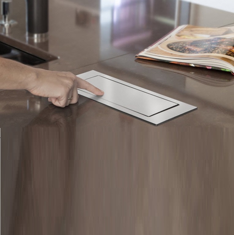 - Estetika in diskretnost: Ena izmed glavnih prednosti potopnih vtičnic je njihov minimalističen in eleganten videz. Ko vtičnice niso v uporabi, so povsem skrite in ne motijo estetskega videza prostora. To je še posebej pomembno v modernih kuhinjah in poslovnih prostorih, kjer sta čistost in urejenost ključnega pomena.
